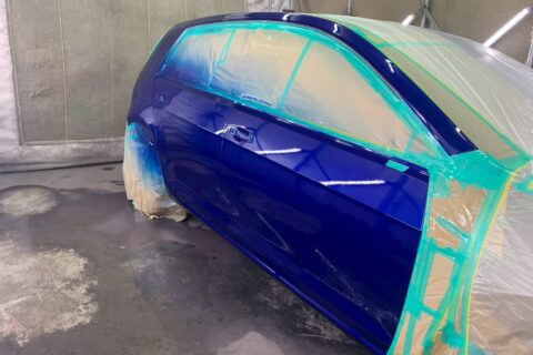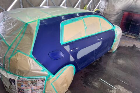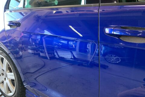 今回は右フロントドアからクォーターパネルに至るまで、広範囲の線傷や凹みがありました。各パネルの傷や凹みを丁寧に板金で引き出し・平滑化し、下地処理を施した後、右側面の塗装を行っています。ゴルフRの美しいボディカラーを再現するため、周囲のパネルと色味が馴染むよう慎重に塗装を施しました。