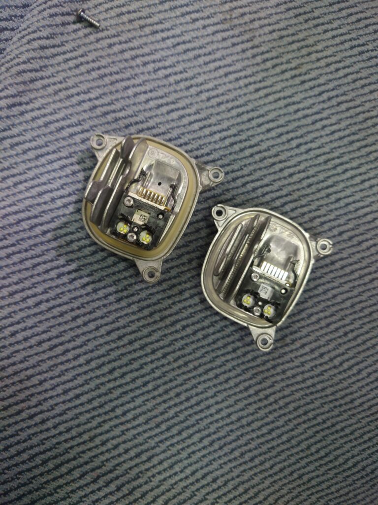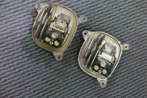 「右側のデイライトが黄色く変色してしまった」とのご相談です。 これはBMWのLEDヘッドライトで比較的よく見られるトラブルで、デイライトモジュールのLEDチップが高熱を持ち、光を導通させるアクリルチューブの根本を焦がしてしまうことが主な原因です。